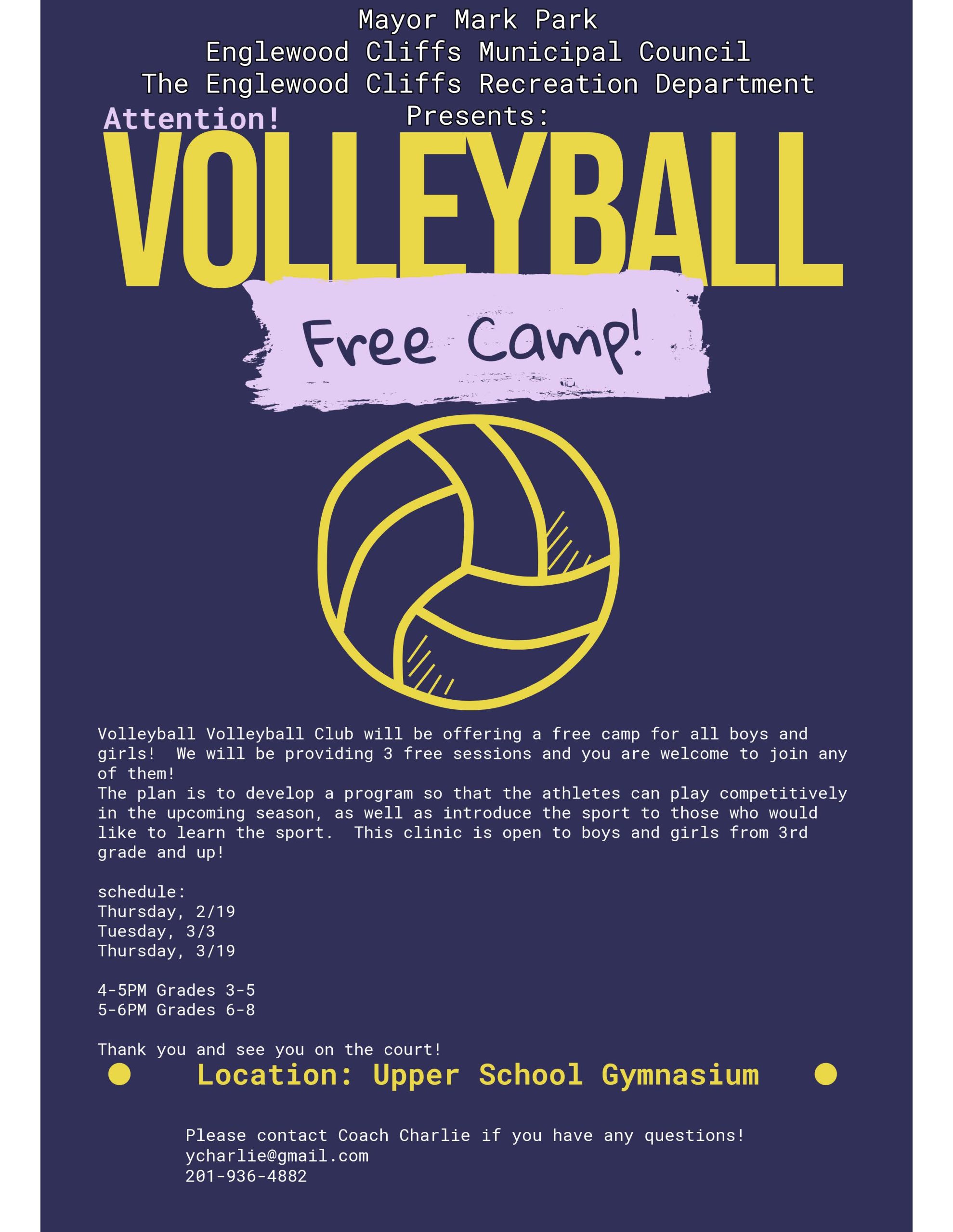 The Englewood Cliffs Recreation Department is pleased to offer a series of free Winter Volleyball Clinics at the Upper School (Upper Gym), sponsored by the EC Recreation Department and conducted by Volleyball Volleyball Club.